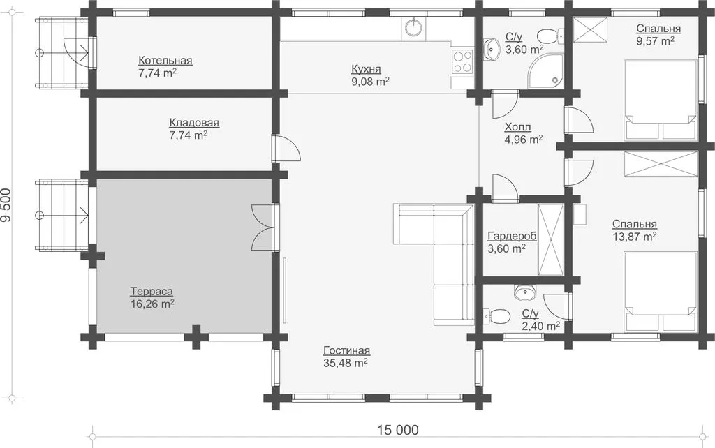 - Размеры дома: 9,5 х 15,0 м.